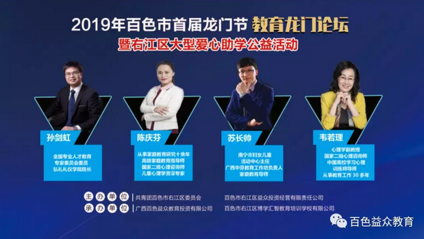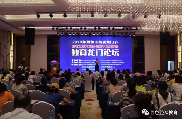 2019年6月16日下午,百色市首屆龍門節(jié)暨右江區(qū)大型愛心助學(xué)第一場公益活動—教育龍門論壇的舉行,拉開了百色市首屆龍門節(jié)公益活動的帷幕。本次論壇由共青團百色市右江區(qū)委員會、百色市右江區(qū)益眾投資經(jīng)營有限責(zé)任公司聯(lián)合主辦,百色市右江區(qū)博學(xué)匯智教育培訓(xùn)學(xué)校有限公司、廣西百色益眾教育投資有限公司聯(lián)合承辦。教育無小事,論壇也得到了各級領(lǐng)導(dǎo)的極大重視。右江區(qū)區(qū)委常委、組織部部長張彩昊,右江區(qū)人民政府辦公室副主任譚再規(guī),右江區(qū)教育局副局長蔣傳剛,共青團百色市右江區(qū)委員會副書記姚賢玉,百色市右江區(qū)益眾投資經(jīng)營有限責(zé)任公司總經(jīng)理趙家臣參加了本次論壇。參加本次論壇的還有右江區(qū)10所小學(xué)的校長、學(xué)校代表。論壇得到了家長熱烈歡迎,到場家長約500人。