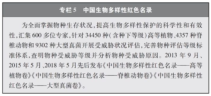 開展全國生物多樣性調(diào)查與評估。大力推進(jìn)生物多樣性保護(hù)重大工程實(shí)施,結(jié)合自然資源調(diào)查、生態(tài)系統(tǒng)監(jiān)測評估等工作,不斷完善生物多樣性調(diào)查與評估能力,首次將生物多樣性指標(biāo)納入生態(tài)質(zhì)量綜合評價(jià)指標(biāo)體系,引導(dǎo)地方加強(qiáng)生態(tài)文明建設(shè)與生物多樣性保護(hù)。開展自然資源調(diào)查,包括森林、草原、水、濕地、荒漠、海洋等,建立自然資源調(diào)查評價(jià)監(jiān)測制度。構(gòu)建了涵蓋2376個(gè)縣級行政單元、樣線總長超過3.4萬公里的物種分布數(shù)據(jù)庫,建立物種資源調(diào)查及收集信息平臺(tái),準(zhǔn)確反映野生動(dòng)植物空間分布狀況。完成長江經(jīng)濟(jì)帶、京津冀等國家戰(zhàn)略區(qū)域180多個(gè)縣級行政區(qū)生物多樣性調(diào)查與評估。組織開展近海漁業(yè)資源調(diào)查,初步掌握近海漁業(yè)資源狀況。陸續(xù)發(fā)布《中國植物紅皮書》《中國瀕危動(dòng)物紅皮書》《中國物種紅色名錄》《中國生物多樣性紅色名錄》,基本掌握生物多樣性總體情況,為加強(qiáng)生物多樣性保護(hù)奠定了科學(xué)基礎(chǔ)。