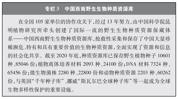 加快重要生物遺傳資源收集保存和利用。中國高度重視生物資源保護(hù),近年來在生物資源調(diào)查、收集、保存等方面取得較大進(jìn)展。實(shí)施戰(zhàn)略生物資源計(jì)劃專項(xiàng),完善生物資源收集收藏平臺(tái),建立種質(zhì)資源創(chuàng)新平臺(tái)、遺傳資源衍生庫和天然化合物轉(zhuǎn)化平臺(tái),持續(xù)加強(qiáng)野生生物資源保護(hù)和利用。實(shí)施一批種質(zhì)資源保護(hù)和育種創(chuàng)新項(xiàng)目,截至2020年底,形成了以國家作物種質(zhì)長期庫及其復(fù)份庫為核心、10座中期庫與43個(gè)種質(zhì)圃為支撐的國家作物種質(zhì)資源保護(hù)體系,建立了199個(gè)國家級畜禽遺傳資源保種場(區(qū)、庫),為90%以上的國家級畜禽遺傳資源保護(hù)名錄品種建立了國家級保種單位,長期保存作物種質(zhì)資源52萬余份、畜禽遺傳資源96萬份。建設(shè)99個(gè)國家級林木種質(zhì)資源保存庫,以及新疆、山東2個(gè)國家級林草種質(zhì)資源設(shè)施保存庫國家分庫,保存林木種質(zhì)資源4.7萬份。建設(shè)31個(gè)藥用植物種質(zhì)資源保存圃和2個(gè)種質(zhì)資源庫,保存種子種苗1.2萬多份。