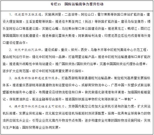 建設高效貨運服務網(wǎng)絡。完善與產(chǎn)業(yè)布局、消費格局相適應的大宗貨物、集裝箱物流網(wǎng)絡,建設大容量、低成本、高效率物流骨干通道,保障化肥等重要農(nóng)資季節(jié)性運輸。有序發(fā)展鐵路雙層集裝箱運輸,探索開行定制化的鐵路直達貨運班列,充分利用富余運力和設施能力發(fā)展高鐵快運等鐵路快捷貨運產(chǎn)品。推動道路貨運高質(zhì)量發(fā)展,提升規(guī)?;⒓s化水平。加強航空貨運能力建設,培育壯大專業(yè)貨運機隊,優(yōu)化航線和時刻配置,提升機場物流組織效率和服務品質(zhì)。完善以物流園區(qū)、配送中心、末端配送站為支撐的城市三級物流配送網(wǎng)絡,加強與干線運輸、區(qū)域分撥有效銜接。完善縣鄉(xiāng)村三級物流服務體系,提升產(chǎn)供銷一體化服務能力。提升口岸通關能力和便利化水平。
