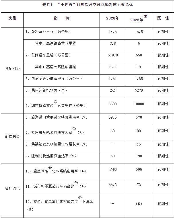 注:①〔〕內(nèi)為5年累計數(shù)。②指納入國家批準的城市軌道交通建設規(guī)劃中的大中運量城市軌道交通項目。③指國際樞紐機場和區(qū)域樞紐機場中連通軌道交通的機場數(shù)量占比。④指重點營運車輛、郵政快遞自有干線運輸車輛、應安裝具備衛(wèi)星定位功能船載設備的客船及危險品船等。⑤指新能源公交車輛占所有地面公交車輛的比重。⑥指按單位運輸周轉(zhuǎn)量計算的二氧化碳排放。