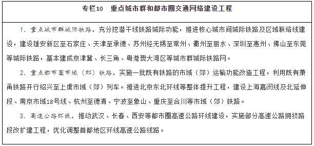 強化重點城市群城際交通建設。圍繞京津冀、長三角、粵港澳大灣區(qū)、成渝、長江中游等城市群,以軌道交通、高速公路為骨干,提升城際運輸通道功能,加強核心城市快速直連,構建多節(jié)點、網(wǎng)絡化的城際交通網(wǎng),實現(xiàn)城市群內(nèi)主要城市間2小時通達。整體推進京津冀、長三角、粵港澳大灣區(qū)城際鐵路和市域(郊)鐵路建設,有序推動成渝地區(qū)雙城經(jīng)濟圈城際鐵路和市域(郊)鐵路建設,加強與高速鐵路、普速鐵路一體銜接,擴大對5萬人口以上城鎮(zhèn)的有效覆蓋。