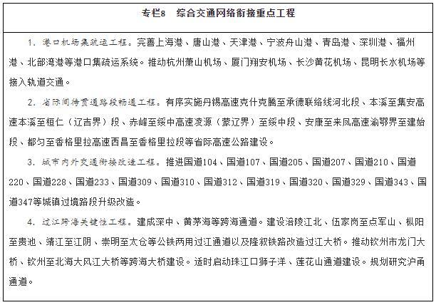 建設多節(jié)點、網(wǎng)格狀、全覆蓋的京津冀一體化綜合交通網(wǎng)絡,基本建成軌道上的京津冀,高標準、高質(zhì)量打造雄安新區(qū)對外交通網(wǎng)絡,加強北京城市副中心與中心城區(qū)、廊坊北三縣交通基礎設施互聯(lián)互通,強化北京冬奧會、冬殘奧會交通保障。依托長江黃金水道,整體設計推進長江經(jīng)濟帶綜合交通運輸體系建設,補強沿江高鐵和鐵路貨運能力,全力打通公路省際待貫通路段,提升江海聯(lián)運、鐵水聯(lián)運發(fā)展水平。推進粵港澳大灣區(qū)基礎設施互聯(lián)互通,優(yōu)化航運和航空資源配置,加強港澳與內(nèi)地的交通聯(lián)系,支持香港提升國際航運、國際航空樞紐地位。推動長三角地區(qū)交通運輸更高質(zhì)量一體化發(fā)展,加快對外交通、城際交通、都市圈交通高效銜接和有機融合,協(xié)同推進港航、海事一體化發(fā)展,推動上海市、江蘇省、浙江省、安徽省共建輻射全球的航運樞紐,加快提升江蘇通州灣江海聯(lián)動示范區(qū)功能,打造長江集裝箱運輸新出??凇嫿êD蠉u內(nèi)暢通、陸島連通、全球通達的現(xiàn)代綜合交通運輸體系,建設現(xiàn)代化綜合交通樞紐,穩(wěn)步推進自由貿(mào)易港建設。構建黃河流域綠色安全便捷綜合交通網(wǎng)絡,強化跨區(qū)域大通道建設。