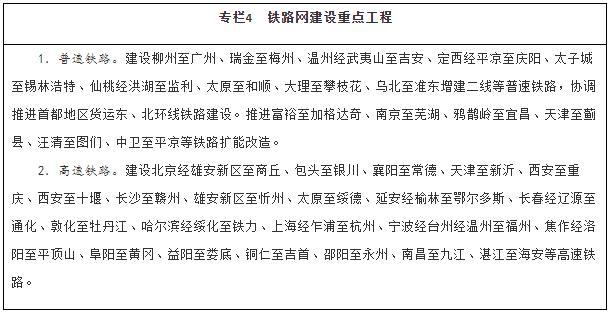 建設現(xiàn)代化鐵路網(wǎng)。堅持客貨并重、新建改建并舉、高速普速協(xié)調(diào)發(fā)展,加快普速鐵路建設和既有鐵路擴能改造,著力消除干線瓶頸,推進既有鐵路運能緊張路段能力補強,加快提高中西部地區(qū)鐵路網(wǎng)覆蓋水平。加強資源富集區(qū)、人口相對密集脫貧地區(qū)的開發(fā)性鐵路和支線鐵路建設。推進高速鐵路主通道建設,提升沿江、沿海、呼南、京昆等重要通道以及京滬高鐵輔助通道運輸能力,有序建設區(qū)域連接線。綜合運用新技術手段,改革創(chuàng)新經(jīng)營管理模式,提高鐵路網(wǎng)整體運營效率。統(tǒng)籌考慮運輸需求和效益,合理規(guī)劃建設鐵路項目,嚴控高速鐵路平行線路建設。