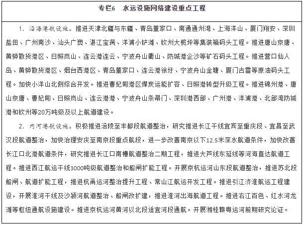 優(yōu)化暢通水運設施網(wǎng)絡。建設京津冀、長三角、粵港澳大灣區(qū)世界級港口群,支持山東打造世界一流的海洋港口,推進東北地區(qū)沿海港口一體化發(fā)展,優(yōu)化港口功能布局,推動資源整合和共享共用。有序推進沿海港口專業(yè)化碼頭及進出港航道等公共設施建設。適度超前建設糧食、能源、礦產(chǎn)資源的接卸、儲存、中轉(zhuǎn)設施,推進沿海沿江液化天然氣碼頭規(guī)劃建設。提升內(nèi)河港口專業(yè)化、規(guī)?;?,合理集中布局集裝箱、煤炭、鐵礦石、商品汽車等專業(yè)化碼頭。加強內(nèi)河高等級航道擴能升級與暢通攻堅建設,完善長江、珠江、京杭運河和淮河等水系內(nèi)河高等級航道網(wǎng)絡,進一步提升珠三角高等級航道網(wǎng)出海能力,全面加強長三角、珠江—西江高等級航道網(wǎng)未達標段建設。推動重要支流航道和庫湖區(qū)航道、內(nèi)河旅游航道、便民碼頭建設。