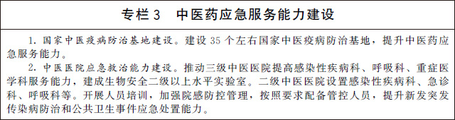 加強(qiáng)中醫(yī)藥應(yīng)急救治能力建設(shè)。依托高水平三級甲等中醫(yī)醫(yī)院,建設(shè)覆蓋所有省份的國家中醫(yī)疫病防治基地,依托基地組建中醫(yī)疫病防治隊伍,提升中醫(yī)緊急醫(yī)學(xué)救援能力。三級公立中醫(yī)醫(yī)院和中西醫(yī)結(jié)合醫(yī)院(不含中醫(yī)??漆t(yī)院)全部設(shè)置發(fā)熱門診,加強(qiáng)感染性疾病、急診、重癥、呼吸、檢驗(yàn)等相關(guān)科室建設(shè),提升服務(wù)能力。