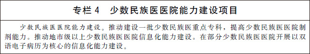 3.發(fā)展少數(shù)民族醫(yī)藥。加強(qiáng)少數(shù)民族醫(yī)醫(yī)療機(jī)構(gòu)建設(shè),提高民族地區(qū)基層醫(yī)療衛(wèi)生機(jī)構(gòu)少數(shù)民族醫(yī)藥服務(wù)能力。改善少數(shù)民族醫(yī)醫(yī)院基礎(chǔ)設(shè)施條件,加強(qiáng)少數(shù)民族醫(yī)醫(yī)院??颇芰?、制劑能力和信息化能力建設(shè)。建立符合少數(shù)民族醫(yī)醫(yī)療機(jī)構(gòu)自身特點(diǎn)和發(fā)展規(guī)律的績效評價指標(biāo)體系。加大少數(shù)民族醫(yī)藥防治重大疾病和優(yōu)勢病種研究力度,有效傳承特色診療技術(shù)和方法。鼓勵和扶持少數(shù)民族醫(yī)藥院校教育、師承教育和繼續(xù)教育。加大對少數(shù)民族醫(yī)藥的傳承保護(hù)力度,持續(xù)開展少數(shù)民族醫(yī)藥文獻(xiàn)搶救整理工作,推動理論創(chuàng)新和技術(shù)創(chuàng)新。